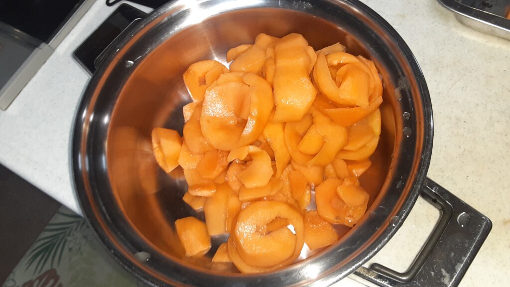 20分ぐらい弱火で果肉が溶けてきたら、しばらく放置後に粉末寒天を規定量の半分ぐらい混ぜる。