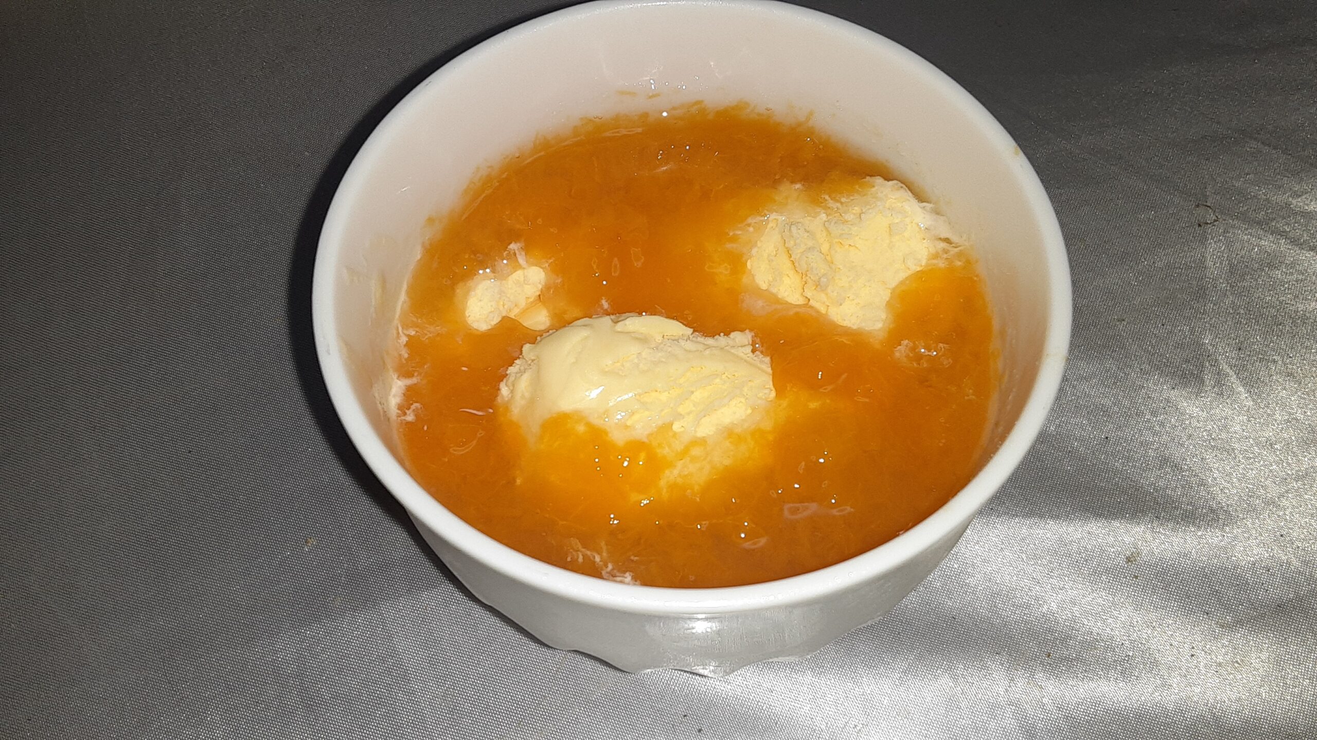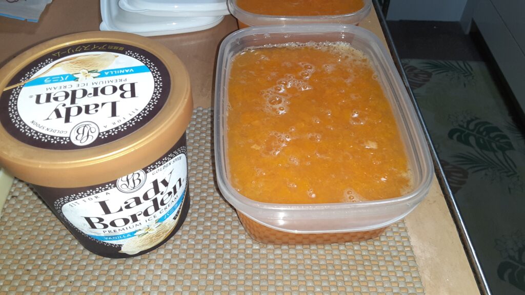 一晩冷蔵庫で寝かして、杏子寒天ゼリーとレディボーデンのバニラアイスを1対1でまぜる。