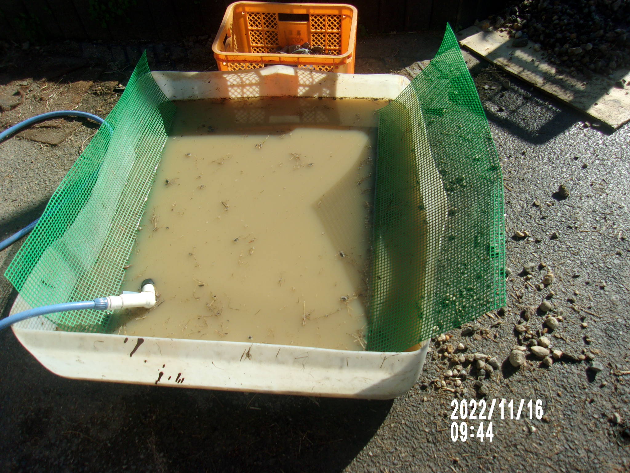 石の手動洗浄ツール 土づくり 2022.11.192022.11.20 土を振るって石の山が出来た。 石を洗えばコンクリートの材料になる。 身近にあるもので楽に洗う方法を思いついた。 やってみた。 思ったよりも良さそう。 これで次のコンクリート打設に進めるね。