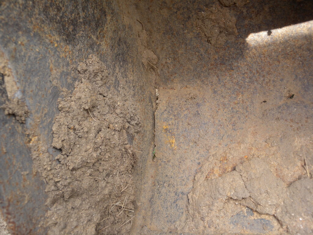 畑の造成が終わり、そろそろバケット交換をしようと思った矢先、標準バケットに穴が開いた。