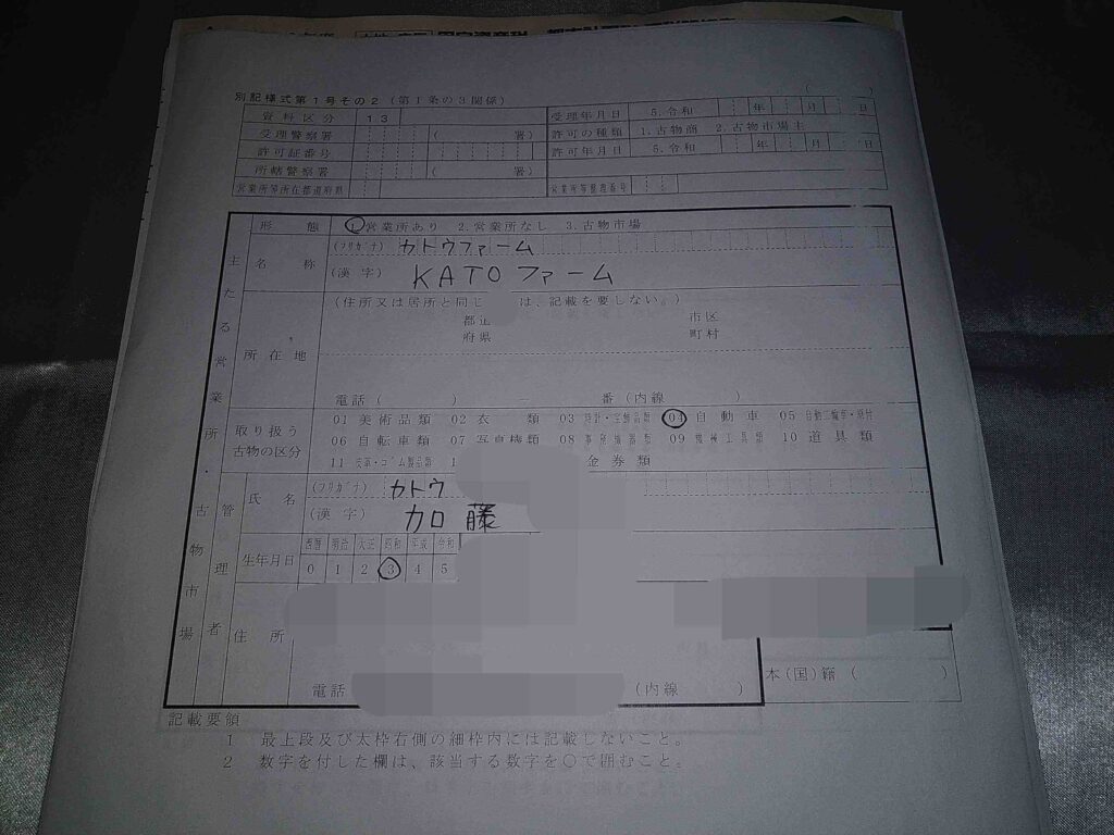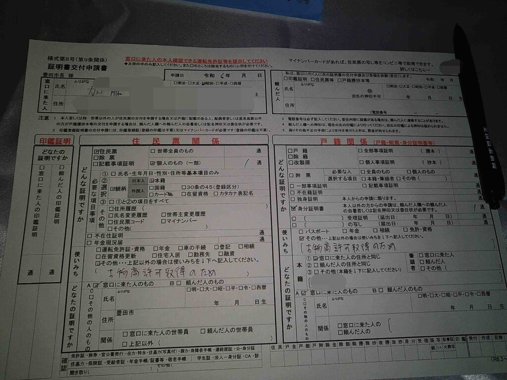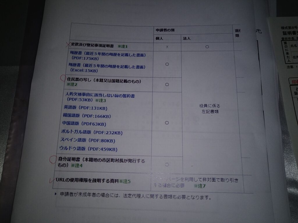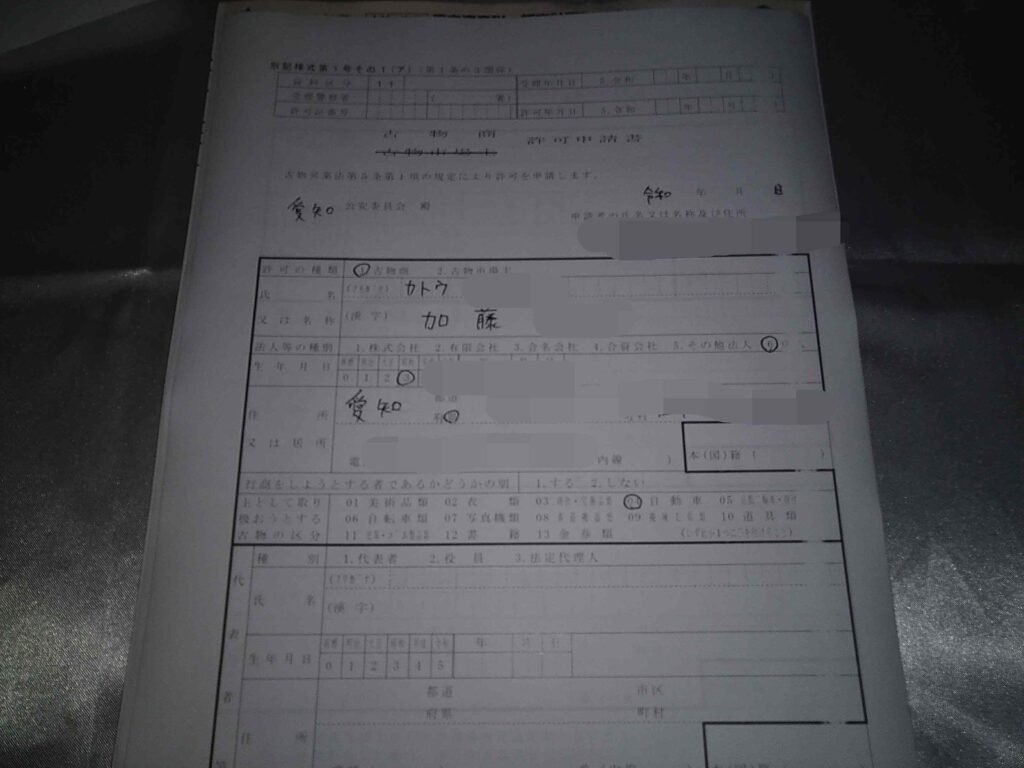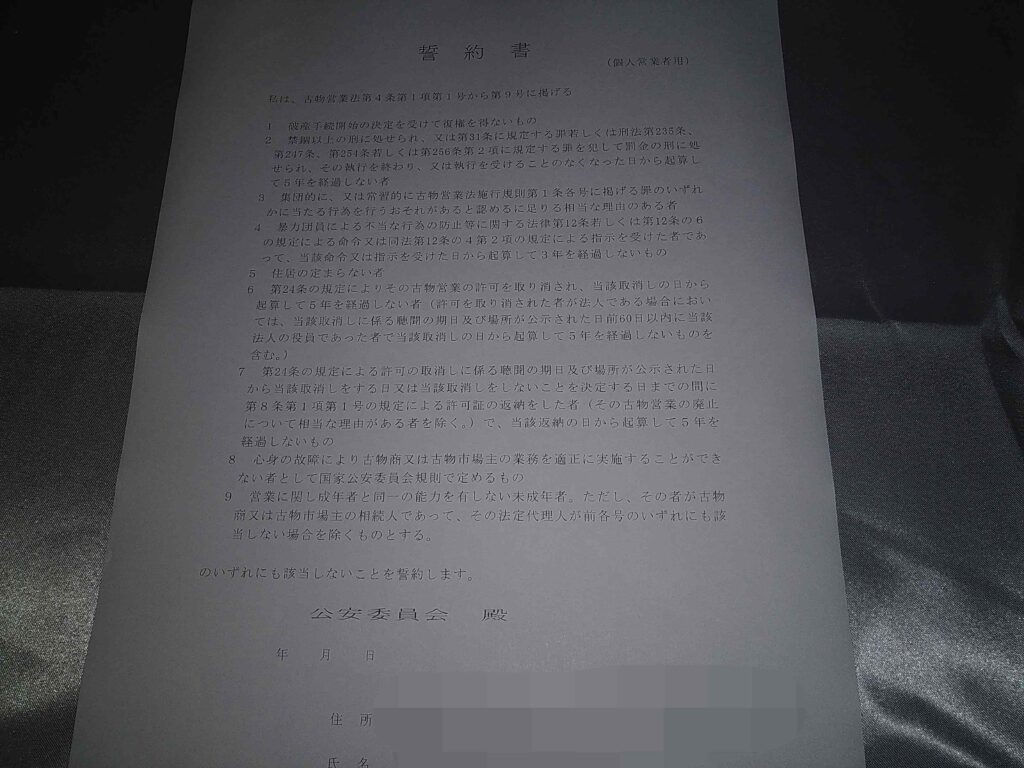私の場合、必要な書類は、『古物商許可申請書』、『略歴書』、『誓約書』、『住民票の写し』、『身分証明書』、『URLの使用権限を疎明する資料』の6種類。